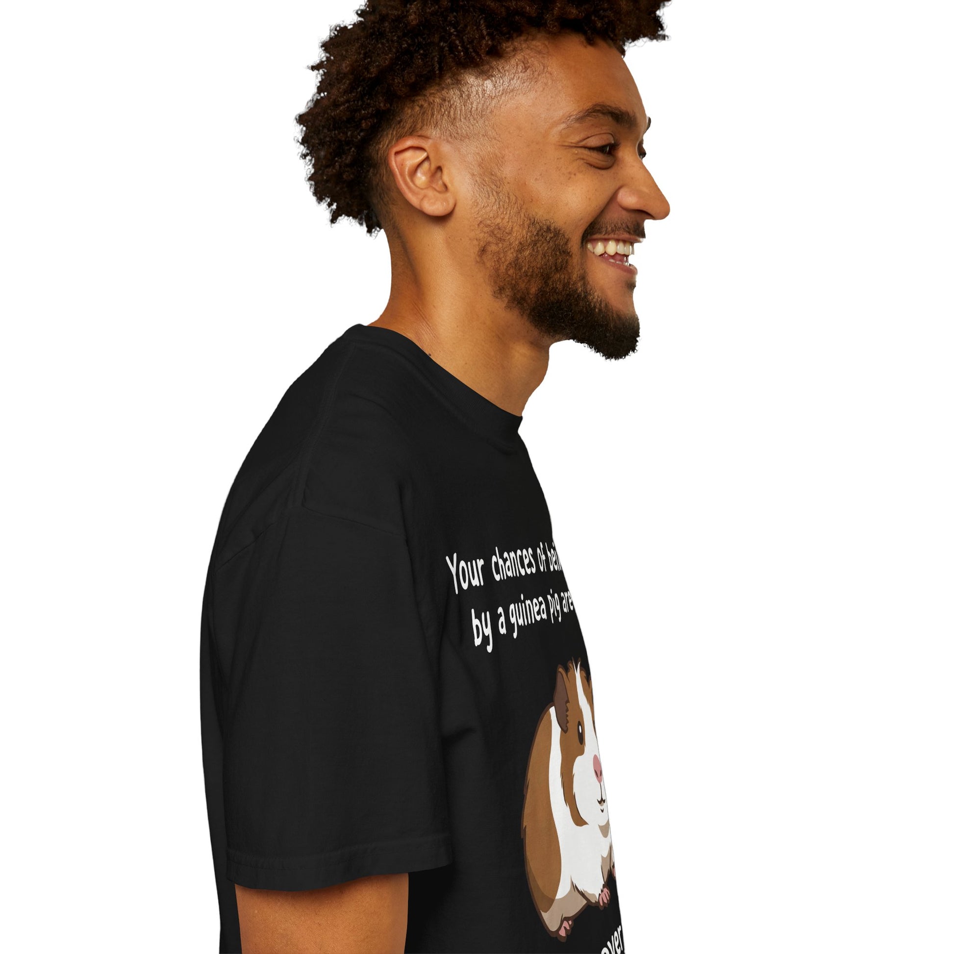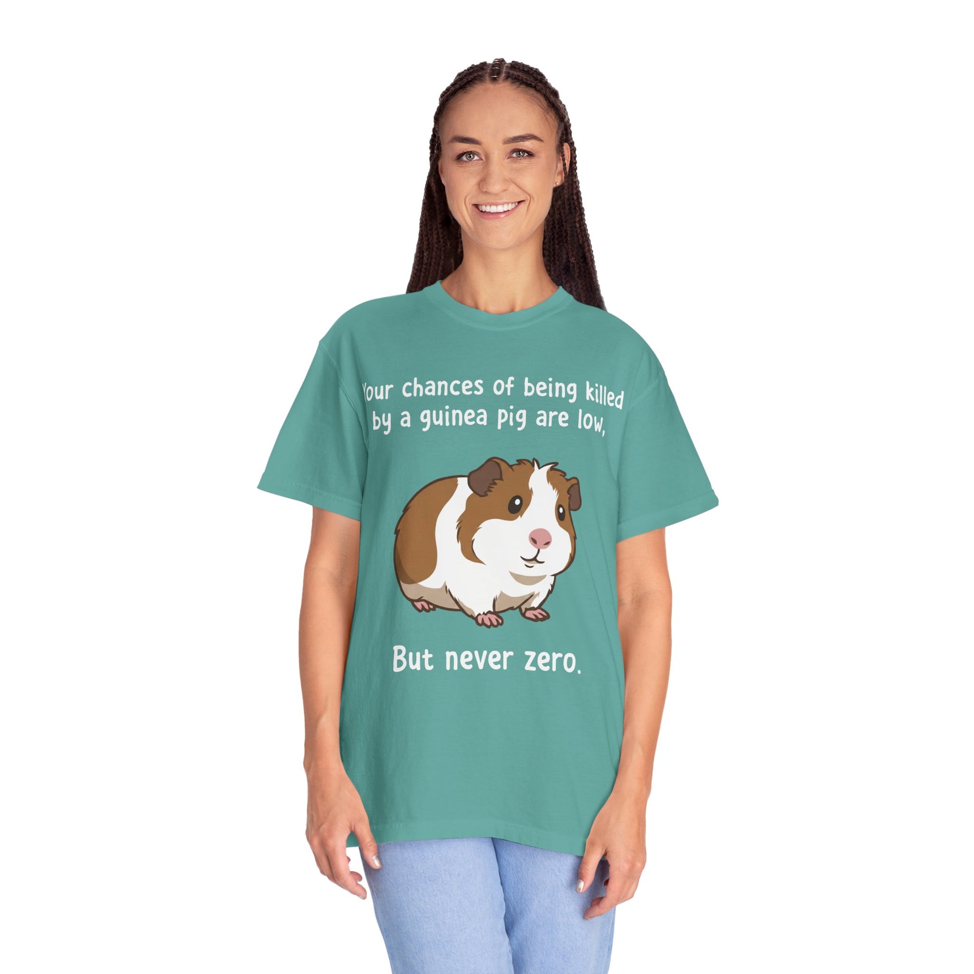 Soft, worn-in comfort with a wink. This garment-dyed tee wraps you in heavyweight cotton that’s been softened by the dyeing process, so it feels like an old favorite from the first wear. The front features a cheeky guinea pig illustration and offbeat line — a little dark, a lot of lovable — that speaks to small-pet owners with a dry sense of humor. The relaxed fit and durable double-needle stitching stand up to everyday wear, while the tubular knit (no side seams) gives a clean, lived-in silhouette. Pick a muted shade to let the illustration pop and wear it around the house, to pet meetups, or when you need a laugh at a casual gathering.